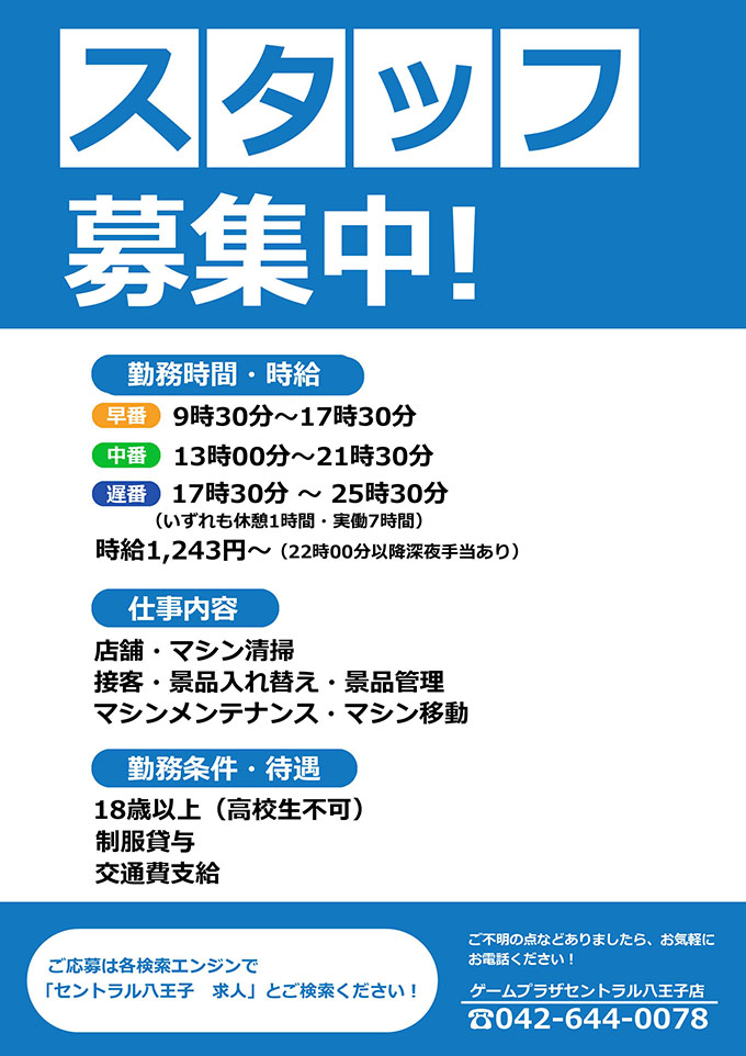 ホーム > ゲームプラザセントラル八王子店 > スタッフ募集